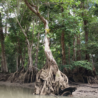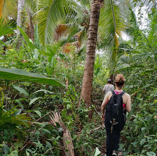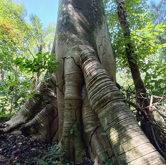 Ausgerüstet sind wir wieder in den Wald für fünf Stunden, auch in den Primärwald mit sehr alten Bäumen,zb. den Elefantenfußbaum