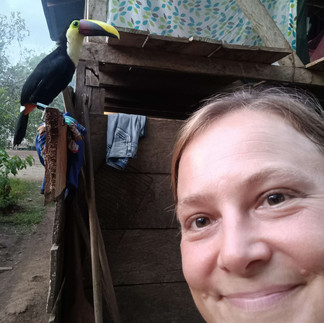 Tiere gibt's auch im Dorf bzw. bei der Familie. Da ist auch der wunderschöne Goldkehl-Tukan, der hier lebt. Er wurde von der Familie gerettet und aufgepäppelt, da er aus dem Nest gefallen war. Sie haben ihn auch wieder in der Wildnis ausgesetzt, die kleine Tochter hat aber vorher den Kopf mit Parfüm eingesprüht und so wurde er von den anderen Tukanen verstoßen und gepickt und kam von allein nach paar Tagen zurück und lebt seitdem hier frei und pickt alles, was sich bewegt. So ein Frechdachs, ist halt erst ein Jahr alt