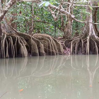 Später sind wir von dem breiten Fluß in einen Seitenfluss mit vielen Vögeln und Mangroven gefahren. Welch tiefe Stille! Wunderschön, die Wurzeln der Mangroven, die sich im Wasser spiegeln.