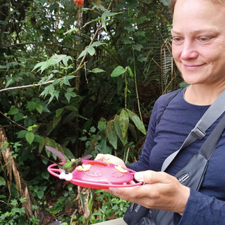 Das war eine sehr schöne Erfahrung, man fühlt die Schwingungen der Flügel. Es gibt hier 300 verschiedene Kolibri-Arten. Der grüne mit den weißen Söckchen ist einer meiner Favoriten.