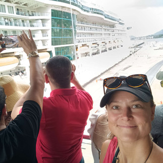 Aber genau richtig, denn es kam in dem Moment die Attraktion des Tages-ein Kreuzfahrtschiff. Jeden Tag werden hier 30-40 Schiffe durchgeschleust. Alle dürfen hier passieren, Hauptsache sie zahlen. Das Segelboot von David, den ich in Valle traf, zahlte 2000$. Das Kreuzfahrtschiff 350.000$. Die silbernen Loks ziehen das Schiff nicht, sondern halten es in Position, manchmal zählen da wenige Zentimeter. Eine solche Lok kostet über 1 Mio. Dollar. Man kann auf den hinteren Fotos erkennen, dass sich das Schiff um 12m abgesenkt hat.