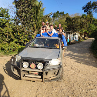 Die Hinfahrt zu den Höhlen in Semuc Champey war schon ein Abenteuer. Man fährt mit einem Jeep hinten wie in einem Kuhtransport mit, mega anstrengend, da man sich gut festhalten muss. Zweimal mussten wir wegen der Baustelle lange warten.
